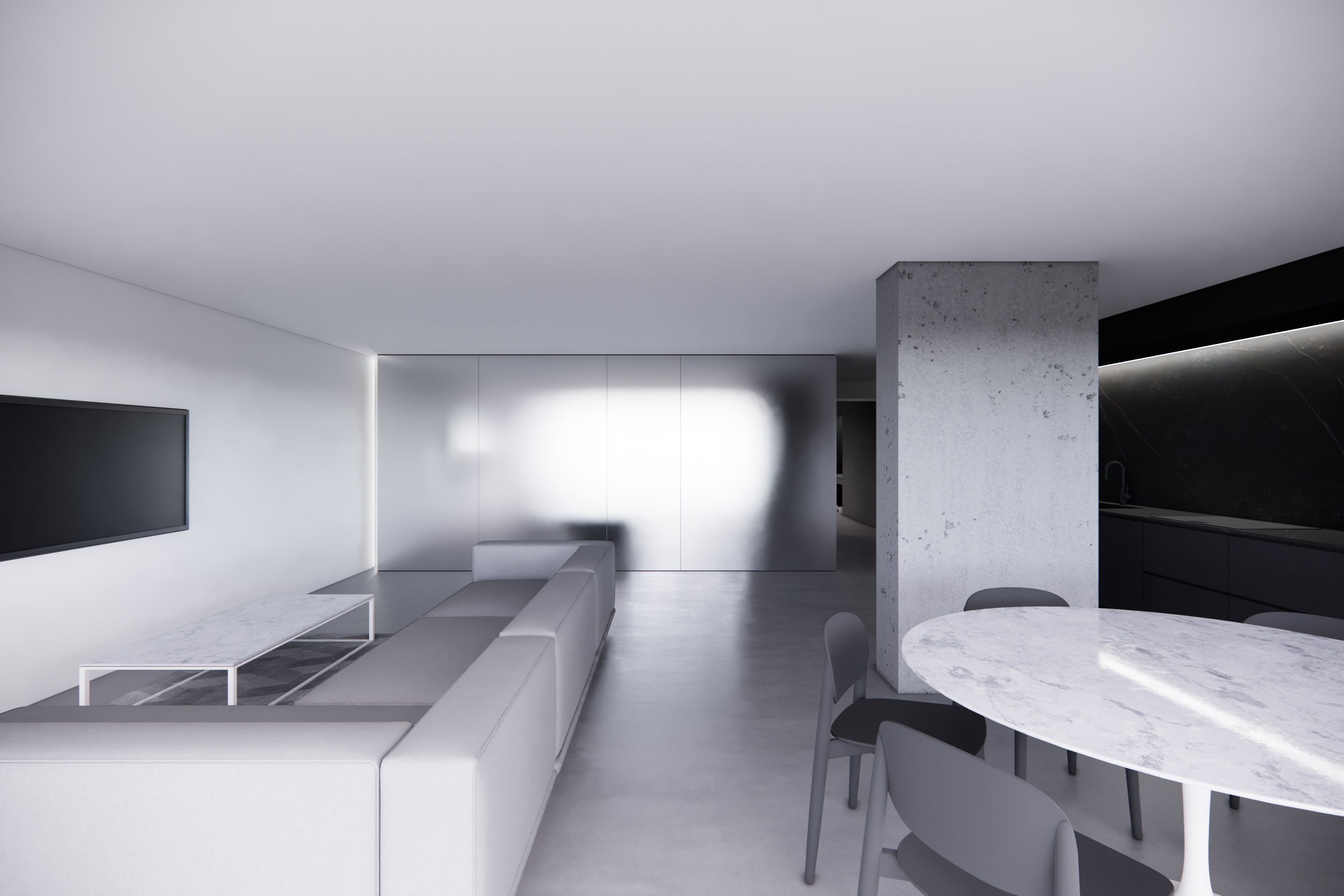 In Chicago’s Gold Coast, a two-bedroom condo was transformed into a minimalist pied-à-terre anchored by an acid-etched mirrored glass volume that conceals the primary bath and closet while organizing the apartment into public and private zones. Positioned in dialogue with an existing exposed concrete column, the volume maintains a fluid spatial flow.