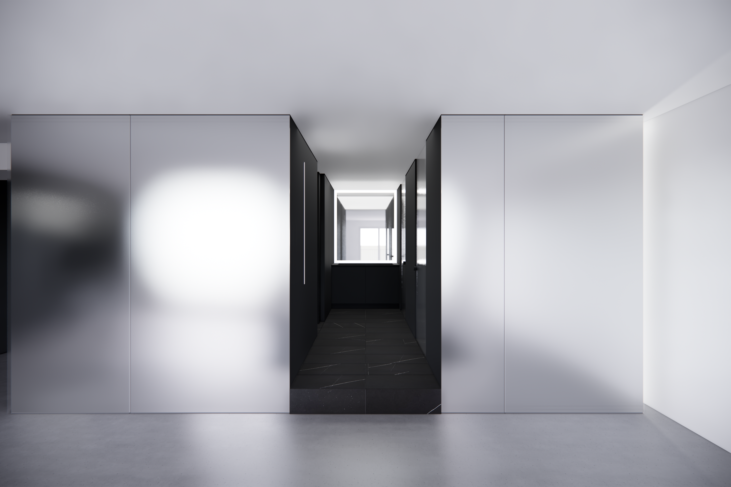 An acid-etched mirrored glass volume anchors a minimalist Gold Coast pied-à-terre, organizing space through light, texture, and subtle materials.
